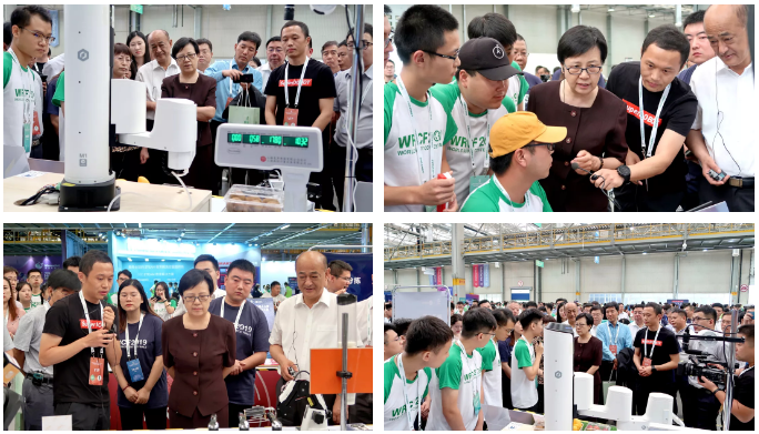 開幕式結(jié)束后,在越疆 CEO 劉培超的陪同下,魯昕會(huì)長(zhǎng)、保定市委書記聶瑞平等領(lǐng)導(dǎo)一行參觀了機(jī)器人工業(yè)設(shè)計(jì)賽賽場(chǎng)各院校創(chuàng)新設(shè)計(jì)的水果沙拉機(jī)器人、危險(xiǎn)動(dòng)物自動(dòng)投食機(jī)器人、自動(dòng)垃圾分揀機(jī)器人、RFID 外殼定制及視覺(jué)檢測(cè)封裝流水線、超市智能散裝稱重系統(tǒng)等工業(yè)機(jī)器人。