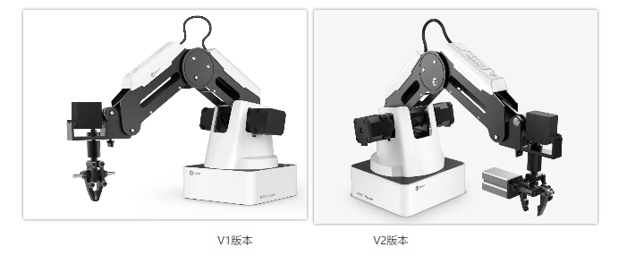 V1 版的大臂和小臂采用連桿的連接方式,V2 版進行了結構設計優化,變更為軸承+連桿,提高了機械臂運行軌跡的精準度,如:激光雕刻,寫字畫畫的軌跡更準確,連續等。