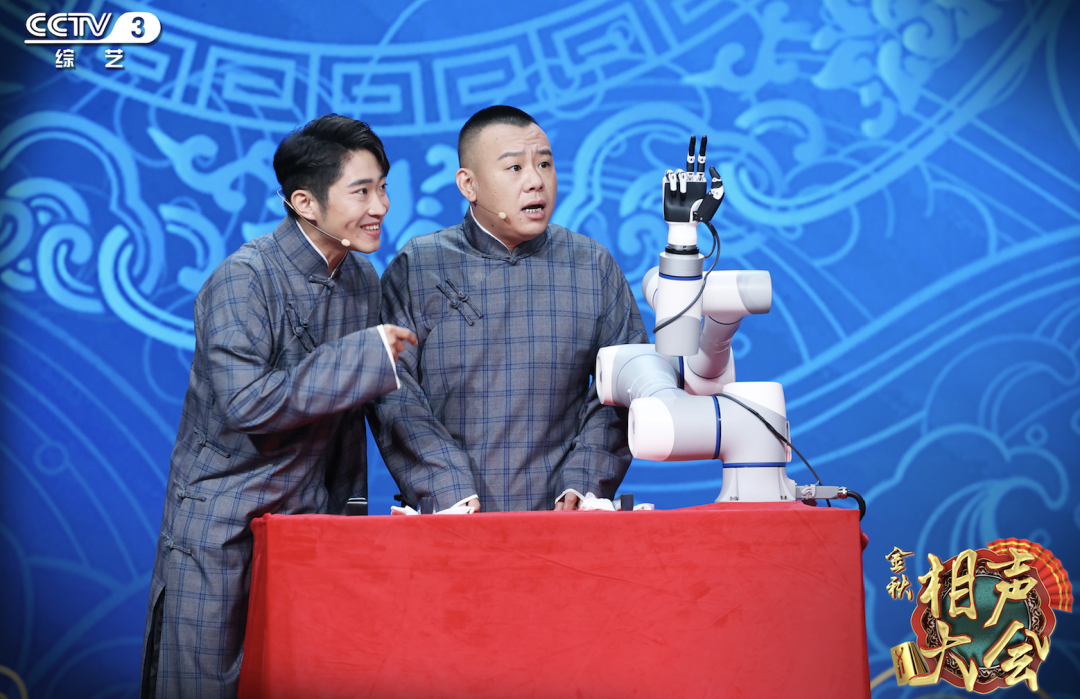 節目之中,CR5 協作機器人搭配仿人五指靈巧手,通過做出比 2、比 3、點贊等示意手勢,巧妙回應了相聲演員的靈魂質問。