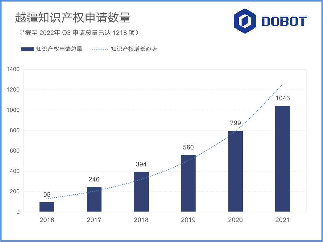 創立七年來,關鍵技術自主創新,始終是推動越疆快速發展的第一引擎。截至 2022 年第三季度,越疆已累計申請知識產權1218 項、軟件著作權 99 項,專利總數 858 項。