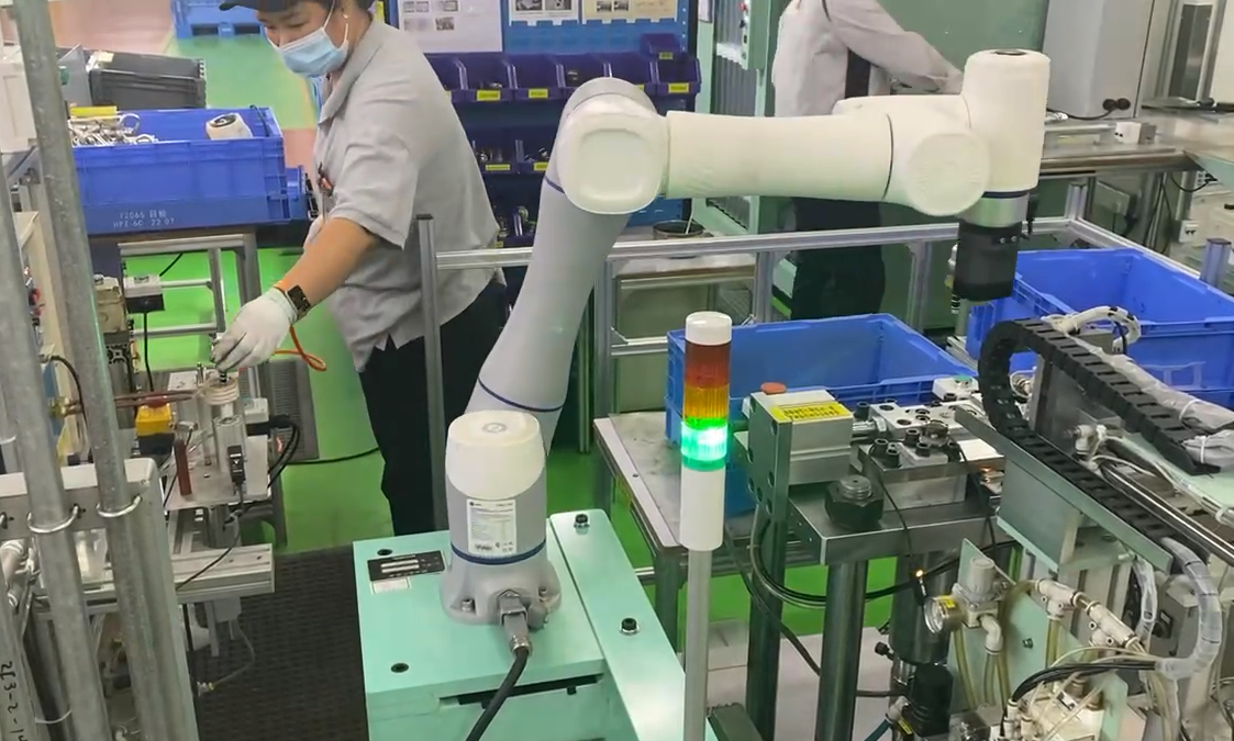 在汽車油管裝配產線上,配有安全皮膚的協作機器人可靈活部署于狹小的工位上,高效進行油管接頭裝配上下料任務,與工人協同完成整個裝配流程。該自動化方案無需加裝安全護欄,避免對產線進行大面積改造,使機器人與工人在生產中協作更為緊密,效率更高。