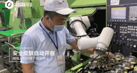 在金屬工件精加工車間的實際運用中,搭載安全皮膚的協作機器人在偵測到人進入 15 cm 范圍時,會立刻停止運行,在人離開后,機器人馬上自行恢復運行。這使得在機床上下料環節中,操作人員能隨時對產品進行抽檢。