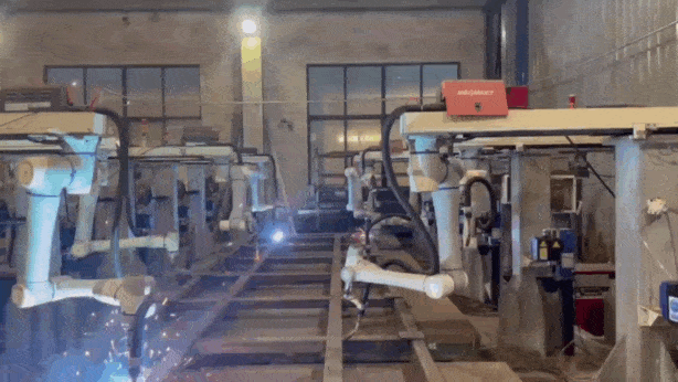某廠鋼結(jié)構(gòu)生產(chǎn)線上,10 臺(tái)越疆 CR10 協(xié)作機(jī)器人吊裝在移動(dòng)導(dǎo)軌上,進(jìn)行同步焊接,通過(guò)先進(jìn)的自動(dòng)起弧、斷弧續(xù)焊與擺焊功能,實(shí)現(xiàn)不同大小鋼架的內(nèi)外、正反面焊接,一次焊接合格率接近100%,速度比人工快 3 倍,整線產(chǎn)能提升至 2 倍以上。