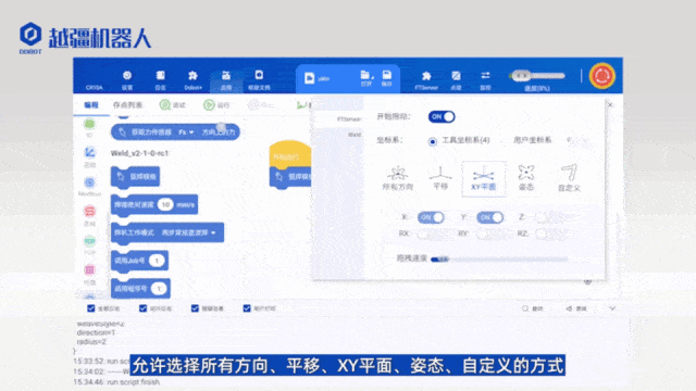 此外,越疆機(jī)器人開發(fā)了一款便捷的力控插件,可配合外置力控傳感器,實(shí)現(xiàn)力控拖動(dòng)快速對(duì)點(diǎn),支持所有方向、平移、XY平面、姿態(tài)及自定義拖動(dòng)方式,大大提升了焊接編程的效率。