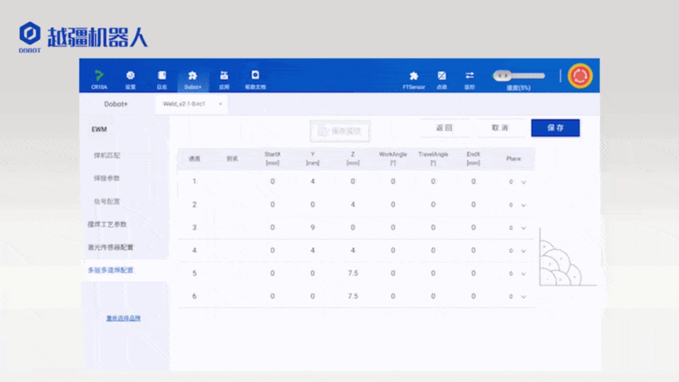 在面對(duì)形狀多變、種類繁雜的復(fù)雜工件時(shí),傳統(tǒng)自動(dòng)化焊接技術(shù)往往難以保證焊接質(zhì)量和效率。越疆焊接工藝包提供多種擺焊方式,包括三角形、螺旋、梯形、月牙、正弦,使得焊接更靈活。同時(shí),越疆多層多道焊接功能,可自行設(shè)置焊道與焊層,確保厚工件焊接的牢固性。