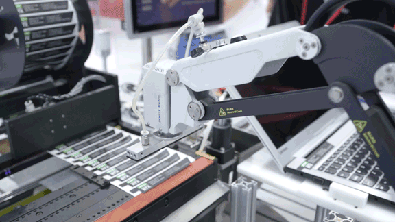 自動貼標(biāo)解決方案采用越疆 MG400 工業(yè)級桌面機(jī)械臂進(jìn)行標(biāo)簽抓取,再經(jīng)過視覺系統(tǒng)的位置糾偏,最后將標(biāo)簽精準(zhǔn)貼合到指定位置,貼標(biāo)精度可達(dá)±0.05 mm。