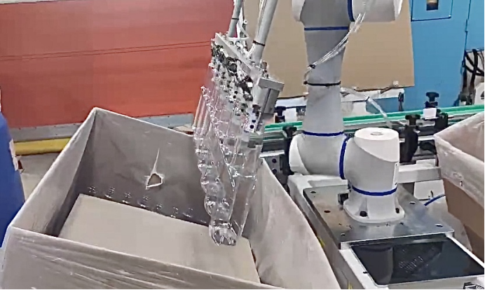 通過簡單配置,協作機器人可以精確且快速地將瓶裝飲料、罐頭食品或包裝零食的不同堆疊箱放置到托盤上。這包括堆疊單層或雙層箱子、添加層板或創建更復雜的堆疊排列。協作機器人還能確保箱子方向一致,這提高了托盤的穩定性和均勻性,對安全高效的運輸至關重要。