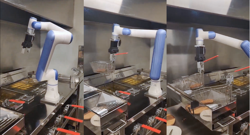 在快餐環境中,協作機器人可以完美地炸雞。它們將雞排放入油炸鍋,監控烹飪時間,并在完成后將其提起。這種自動化確保每一塊雞肉都煮得金黃酥脆。